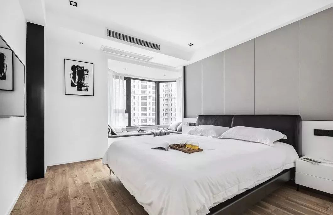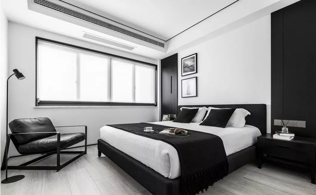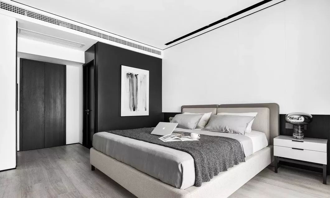 主卧的背景是干净素然的白色墙板与黑色木纹组成,黑色的低调深邃与白色的明亮白净,搭配上低饱和度的灰色软装,在空间中产生互动的对话。