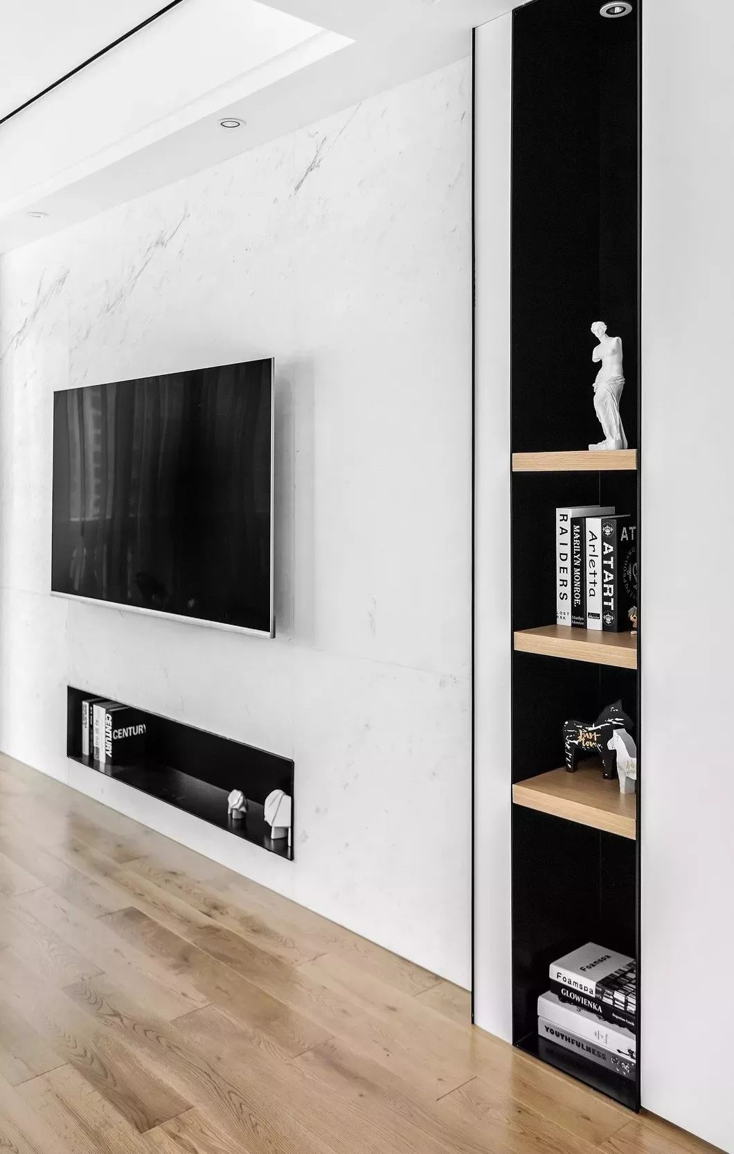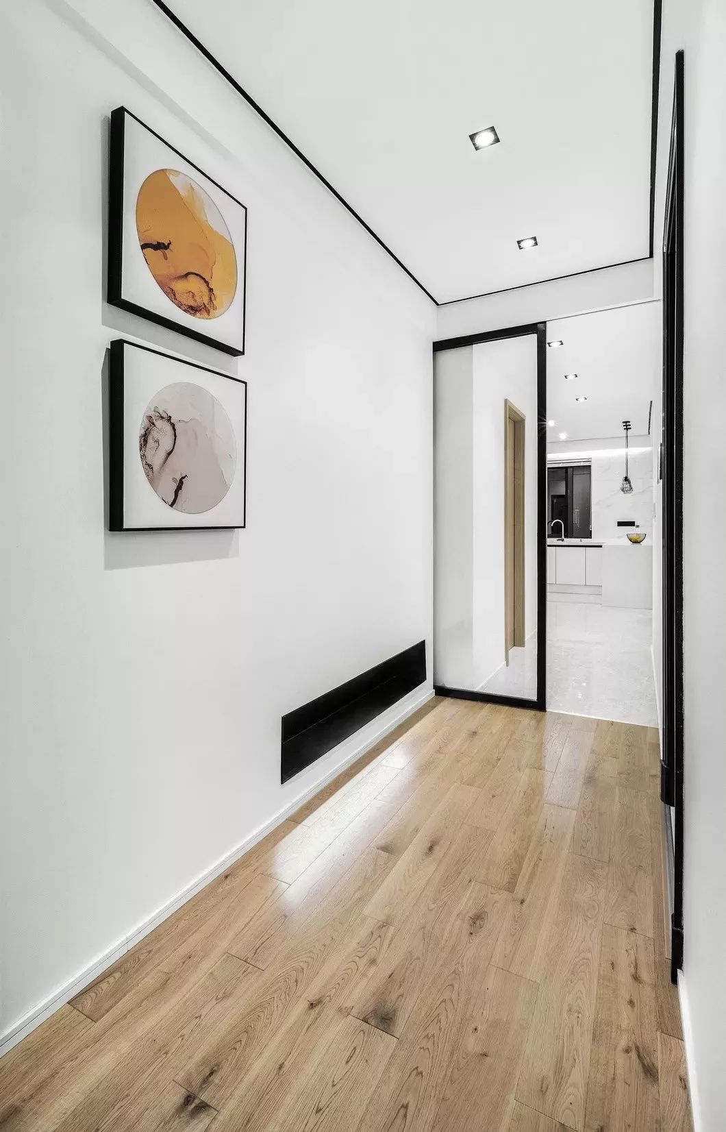 入户之后首先面对的是过道,为了减少狭窄空间的压抑感并确立简约风格的第一映像,设计师在这里舍弃过多造型,采用大面积留白并通过黑色壁龛和挂画增加空间的立体感,起到视觉的延伸和色彩的平衡。