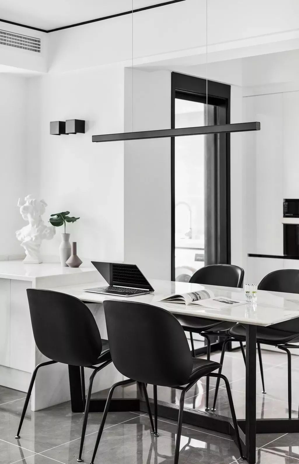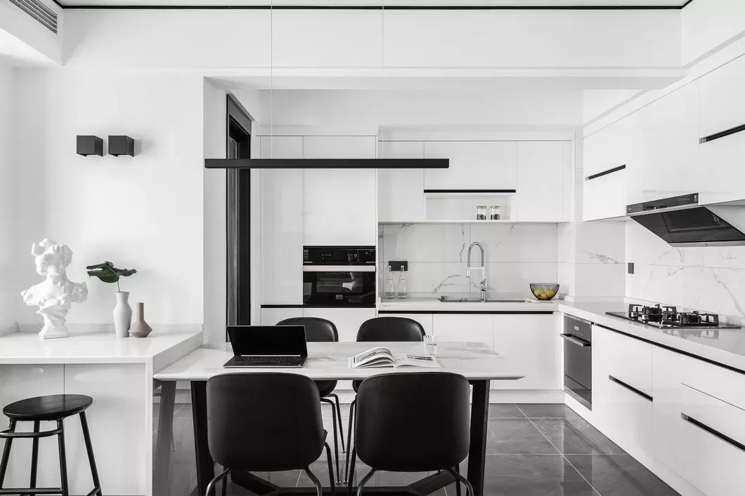 餐厅采用大片的留白,使得视线更加开阔,布局更加流畅。大面积采用了大理石纹理瓷砖,反射产生的镜面效果对空间进行提亮。白色的橱柜加上黑色线条的描边,黑色的吊灯给空间增加了几分律动。