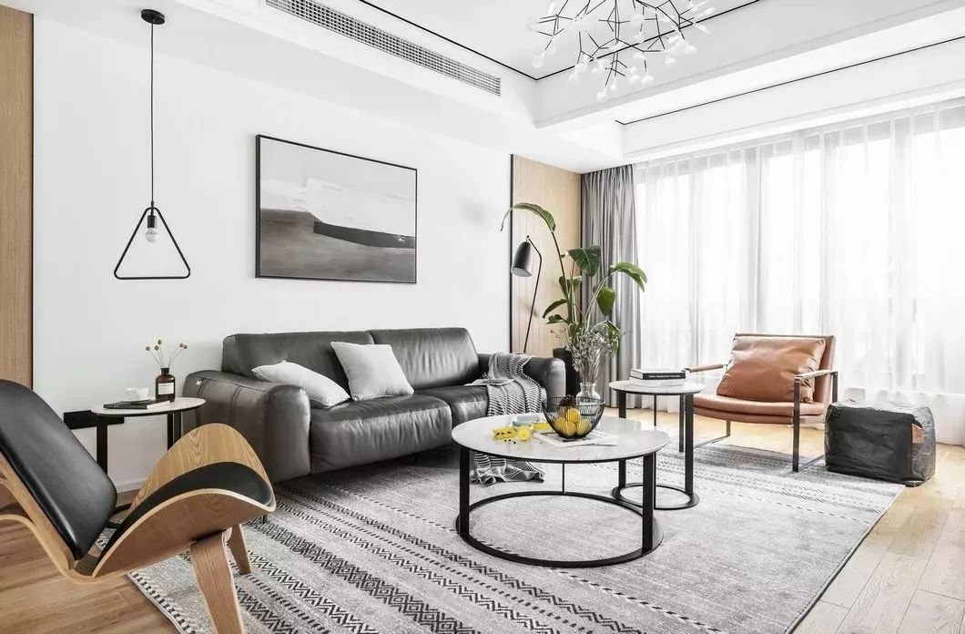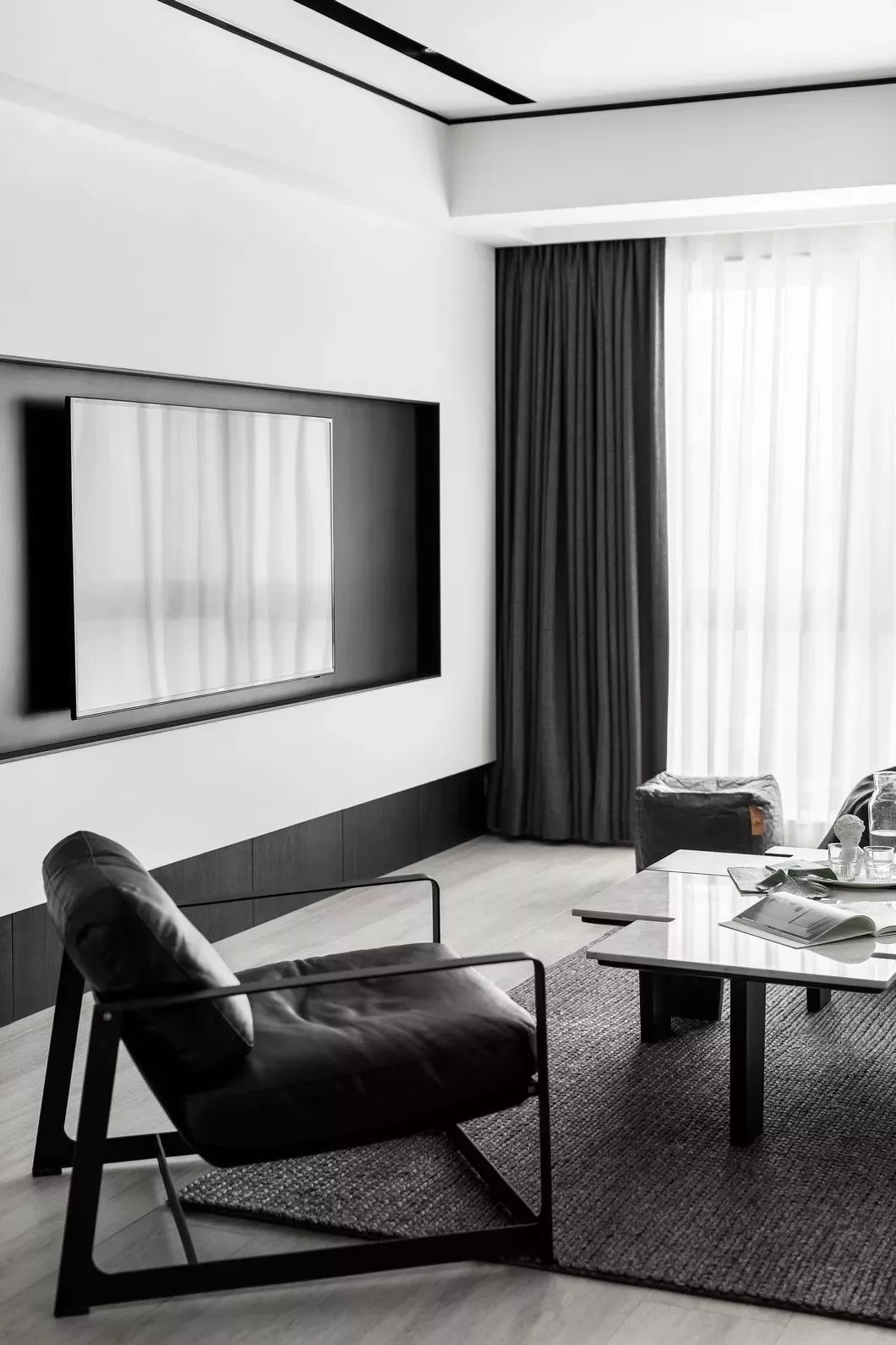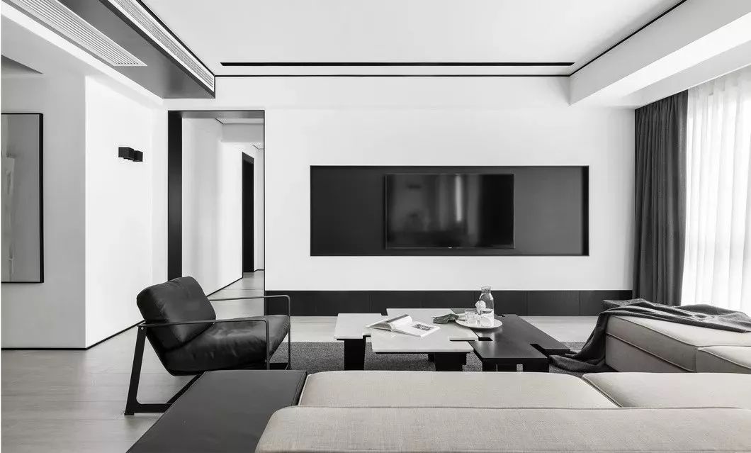 晨曦透过窗帘射入客厅,黑白灰的主色调完美承接、过渡了这道自然光线。