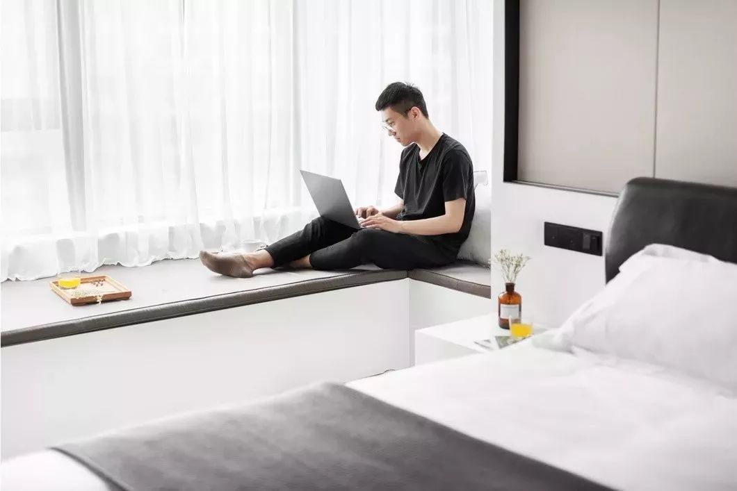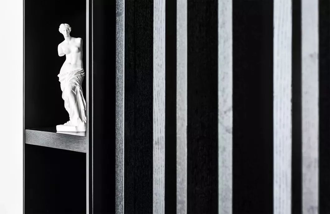 黑色的墙板、柜门、床靠,白色的墙面和床品,不同的黑与白交织搭配,构成了房间的黑白基调。