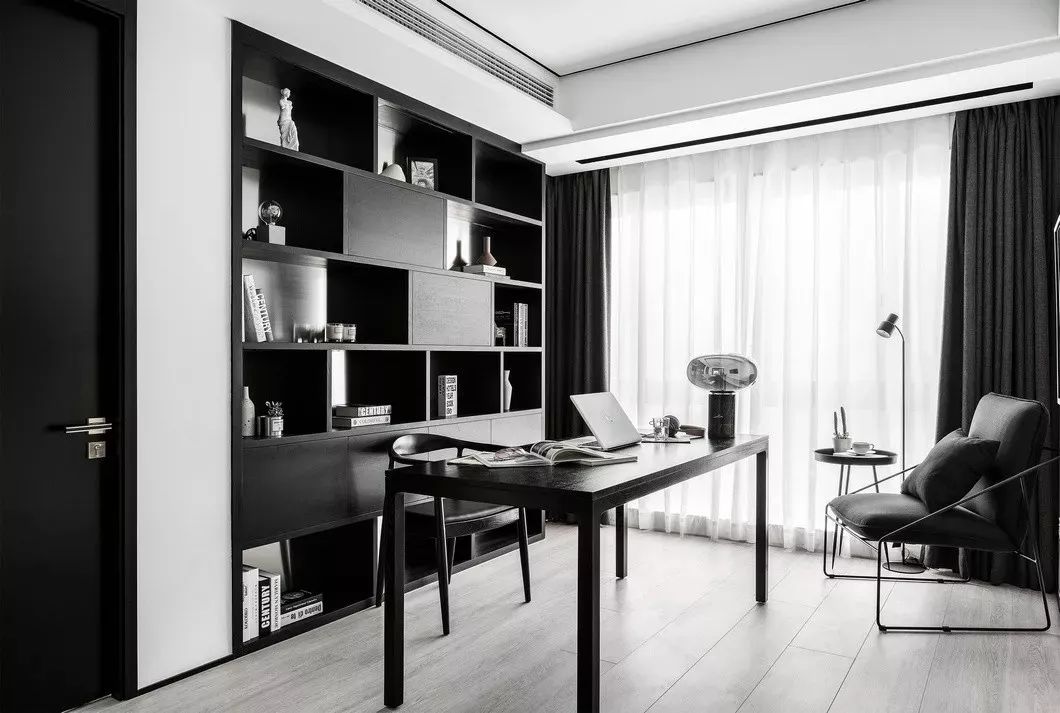 通彻明亮的落地窗使得书房内的采光十分通透,书房整体以黑色为主体,暗含沉稳的工作态度。背后的书柜,木纹穿插着不锈钢材质,自然与工业的碰撞,展现出时尚性和当代性。