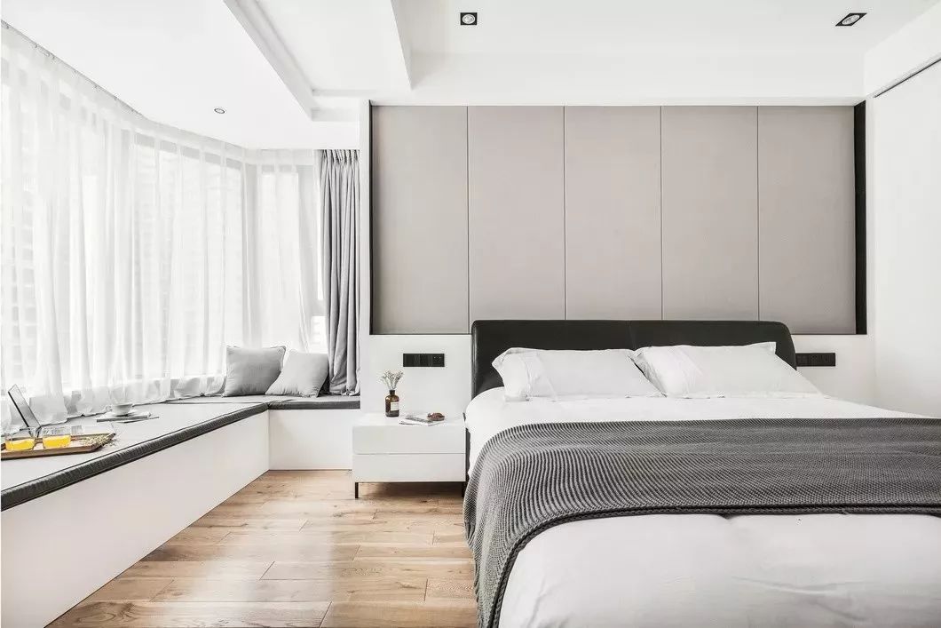 设计师将主卧窗台做成大飘窗,可以卧坐于此赏景发呆,其下也可以收纳杂物。