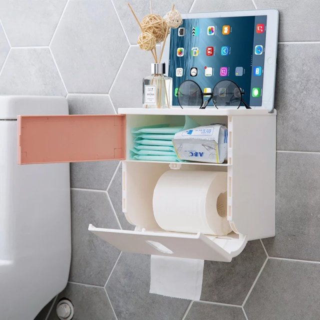 按压式开关方式,无痕胶粘贴无需打孔,上下双层收纳,可以放置纸巾和一些小物品,两个纸巾出纸口,卷纸抽纸都能放。