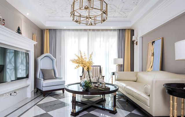 网点形铺法是目前比较流行的做法,一般在客厅外圈走波打线,然后在里面做上网点造型。这种铺法一般采用撞色方式,整体看起来就像星星一样美丽,因此也有“满天星造型”之称。但也有美式田园风格的客厅不做波导线,也采用将瓷砖斜铺,做成网点造型也很不错。