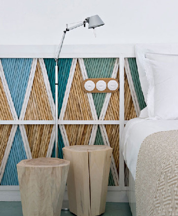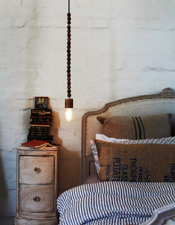卧室床头吊灯不仅能解放出床头柜面上的空间,如果设计别致,还能提升卧室格调。那些别致的床头吊灯,它们或妩媚或阳刚、或可爱或充满创意,而卧室也随着不一样的吊灯展现出不一样的情调。这个床头风景的设计结合了很多的自然元素,以树状做床头柜,以竹篱笆装饰墙头墙面,清新自然。